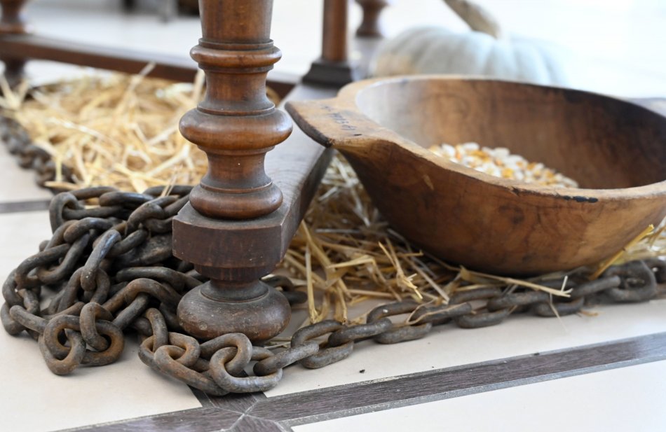 Nohy stola opásané reťazou na výstave s vianočnou tematikou.