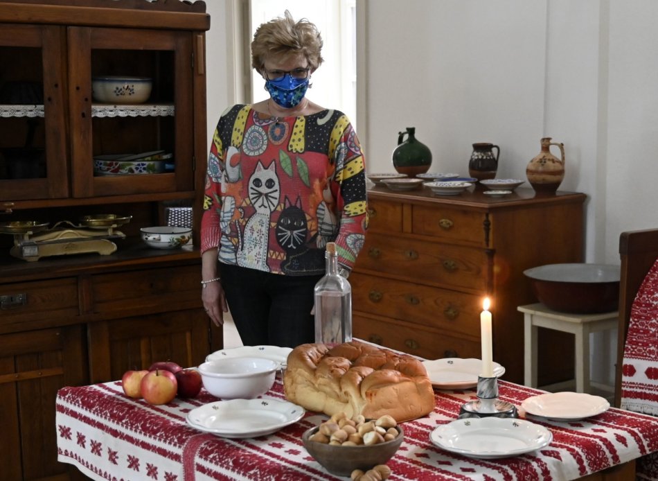 Na snímke riaditeľka múzea Beáta Kereštanová pózuje na výstave s vianočnou tematikou - Kračunska chiža v Múzeu a Kultúrnom centre južného Zemplína v Trebišove.
