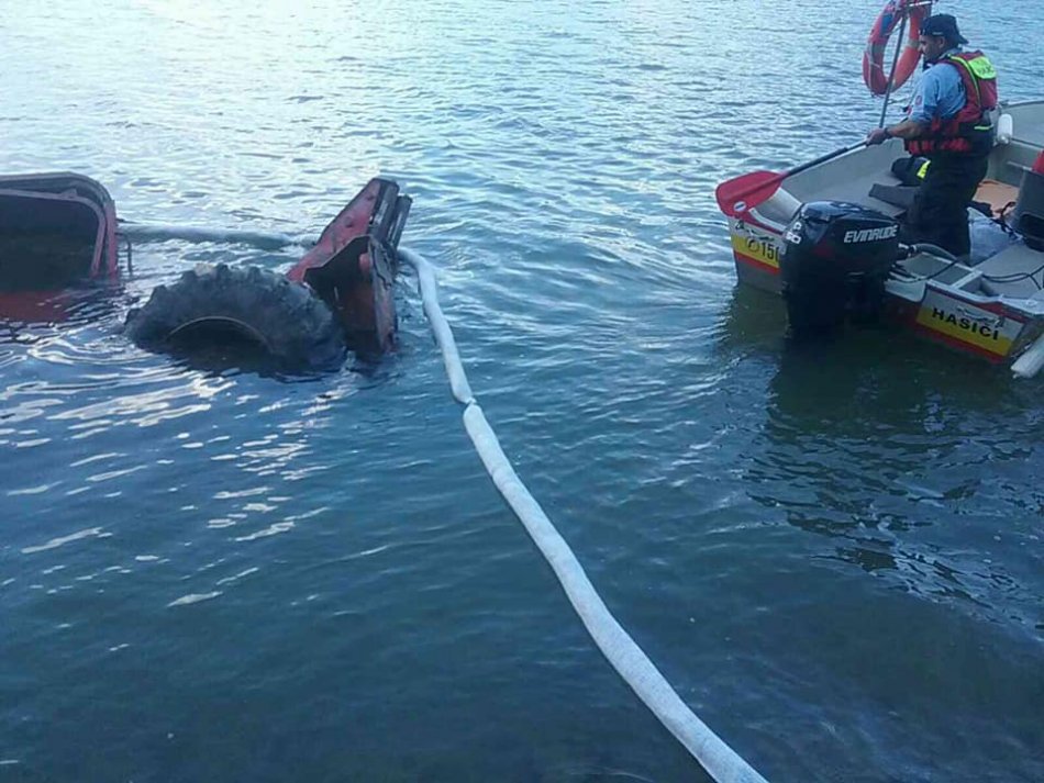 Galéria k článku Do vodnej nádrže sa zrútil traktor: Na Domaši boli v pohotovosti hasiči, FOTO