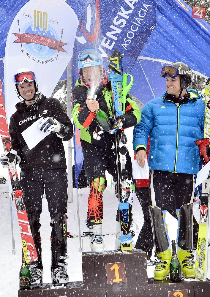 Martin Hyška (vľavo) na stupňoch víťazov v slalome mužov v rámci Medzinárodných majstrovstiev Slovenska v alpskom lyžovaní v Jasnej 27. marca 2013.