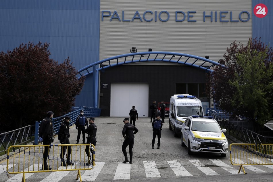 policajti stoja pred ľadovým klziskom v Madride, ktoré sa stalo dočasnou márnicou pre obete ochorenia COVID-19