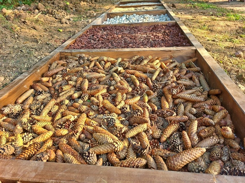 Chodník obsahuje najprv piesok, následne malé kamene, štrk, okrúhle kamene, mulčovaciu kôru a na záver šišky.
