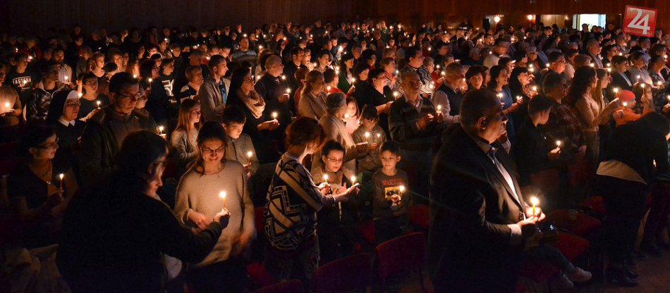 Galéria k článku FOTO: Plná sála, more horiacich sviečok. Humenné zažilo unikátnu krížovú cestu