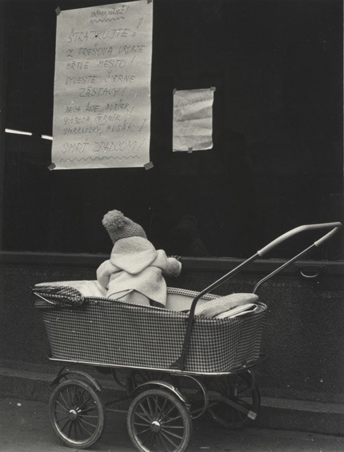 Malý Prešovčan pred výkladom s plagátom s textom „Občania, mládež! Z Prešova urobte mŕtve mesto! Vyveste čierne zástavy!” (ÚPN)