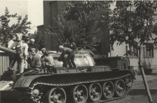Posádka invázneho tanku a deti. Prešov. (ÚPN)