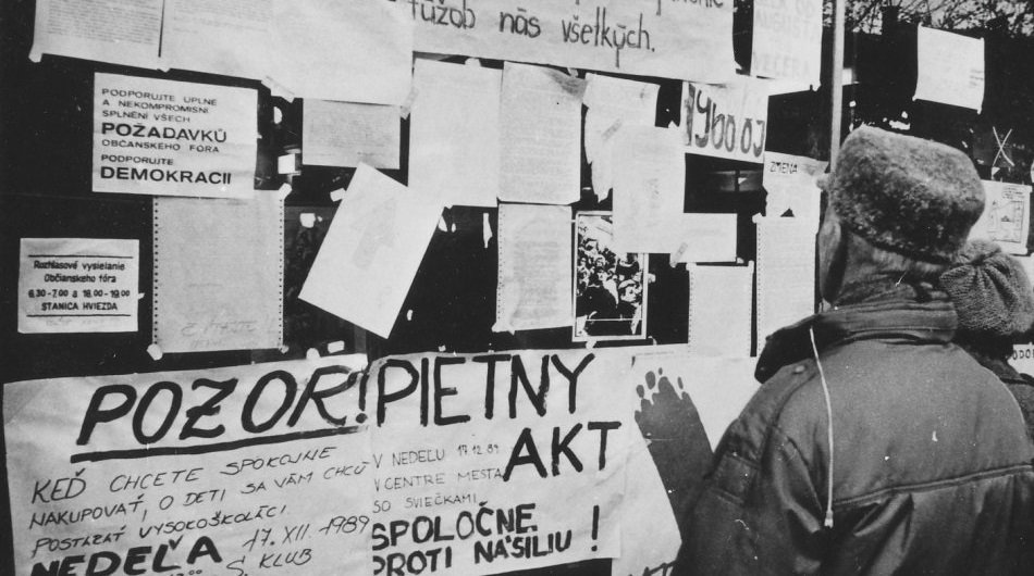 Plagáty a letáky s aktuálnou novembrovou tematikou na Hlavnej ulici v Prešove, rok 1989.