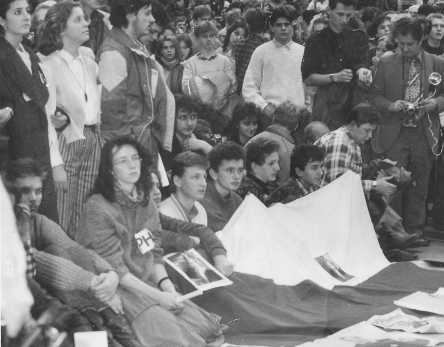 Účastníci mítingu sledujú odpovede V. Havla, ktoré dostával od prítomných, 20.12.1989.