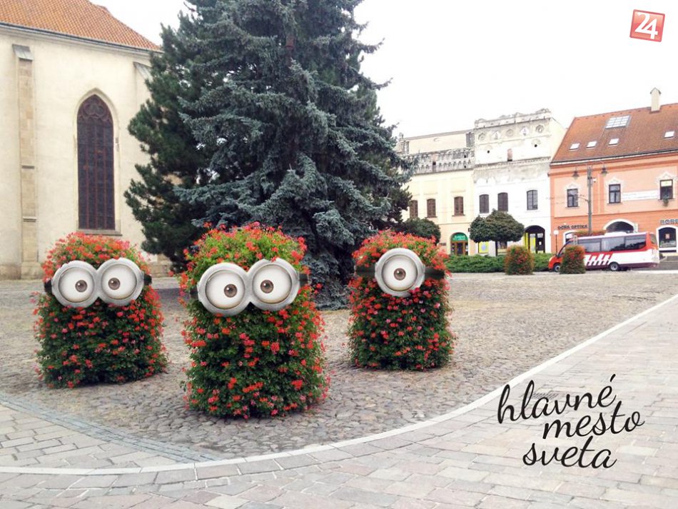 Do kvetináčov sa totiž schovali známe animované postavičky Mimoňov :-) foto: fb Prešov - Hlavné mesto sveta.