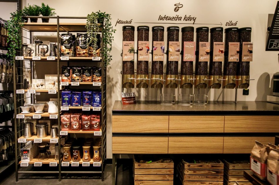 Kávový bar z prírodných materiálov pripomína, že udržateľnosť je pre Tchibo zásadná.