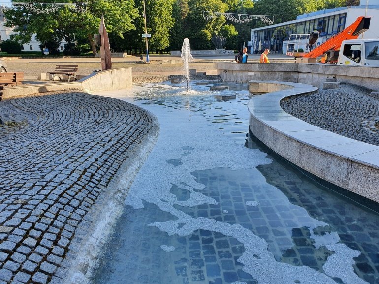 Galéria k článku Pena na hladine a silný zápach! Potok času na námestí niekto znečistil chemikáliou